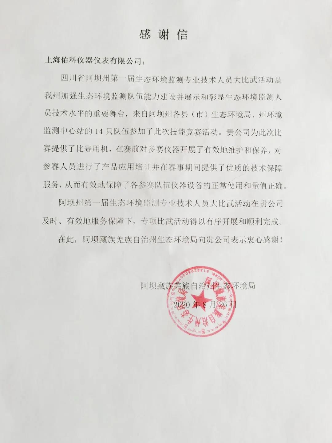 2020年-8月-26日,今天,我们收到了一封来自四川阿坝州朋友的信件,来信是对佑科的支持,是对佑科的肯定与信任,同时也为我们提供了环保仪器研发的动力与信心!